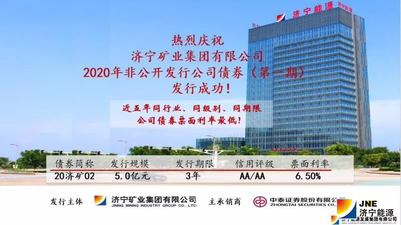 7月17日,济宁能源2020年第一期5亿元非公开发行公司债券在上海证券交易所发行成功,发行期限三年。集团公司党委副书记、总经理张广宇,中泰证券股份有限公司投资银行业务委员会联席主席姜天坊,债券发行部总经理唐文博参加了债券簿记发行仪式。