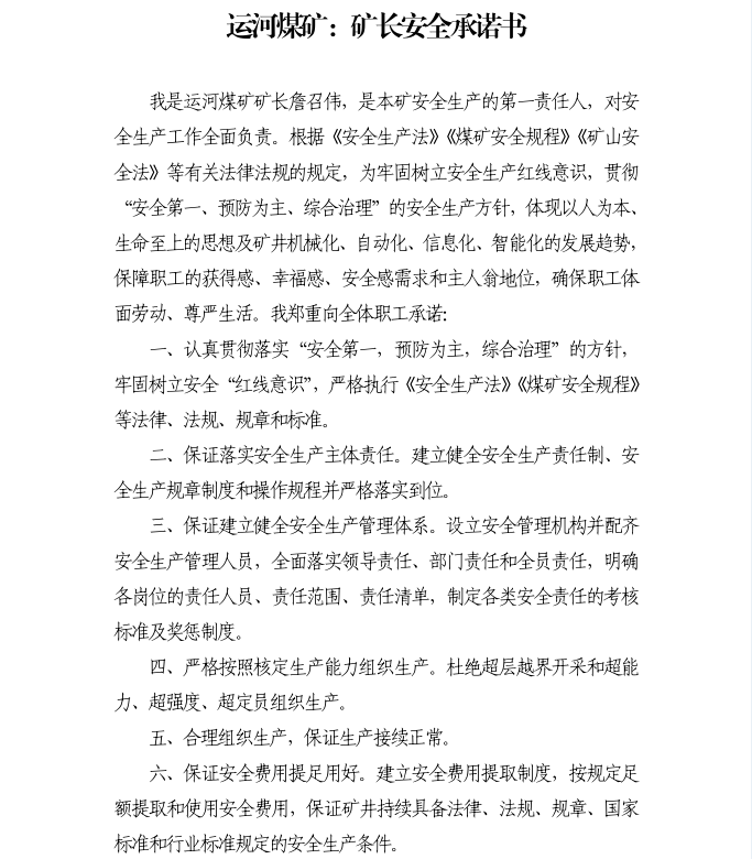 运河煤矿:矿长安全承诺书