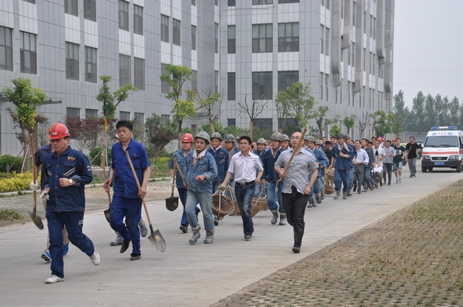 汛期即将临近,为检验雨季“三防”各项工作准备情况,根据矿建工作实际,安居煤矿组织了应急演练活动。下午15:30分,模拟气象台发出橙色预警,预报雨势将由大雨转为暴雨,降雨量可能迅速达到并超过50毫米,矿井工业广场井口及其它地势较低的区域有可能出现被淹没的危险。调度指挥中心接到灾情预报后,立即拉响防汛警报,启动应急预案,同时向井下各施工迎头下达停产撤人命令。各专业小组成员、抢险队员听到警报后迅速响应,各组防汛抢险队员携带抢险工具、物资、车辆设备在副井口附近集结。 15:40分,防汛指挥部成立,抢险救灾总指挥殷然向各组下达抢险命令,分派任务随即开始抢险。主井井口抢险队、副井井口抢险队、机电抢险队、排洪疏通保障队、物资保障对、后勤保障队等各专业队在领到命令后,迅速向各自抢险地点飞奔。15分钟后,主井口、副井口、35KV变电所等重要场所很快建起一道牢固的防洪墙。1550分,副井最后一罐76人全部安全升井。16:00时,险情解除,抢险成功。